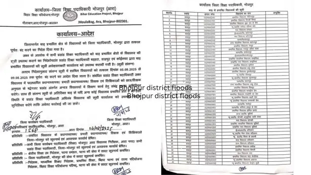 जिला प्रशासन ने एहतियाती उपाय के तौर पर बाढ़ प्रभावित क्षेत्रों के 71 सरकारी विद्यालयों को 5 अगस्त से 9 अगस्त, 2025 तक पूर्णतः बंद करने का निर्णय लिया है। यह निर्णय छात्रों की सुरक्षा सुनिश्चित करने के उद्देश्य से लिया गया है। प्रभावित विद्यालयों में बड़हरा, शाहपुर और कोईलवर प्रखंड के प्राथमिक, मध्य और उच्च विद्यालय शामिल हैं।