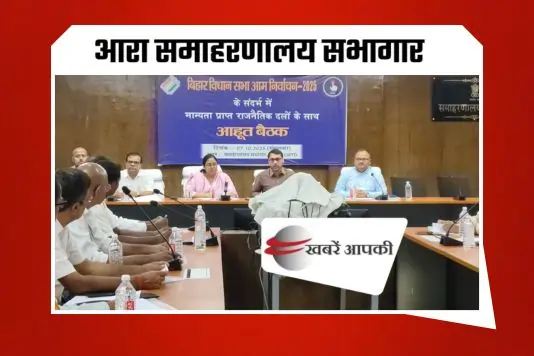 आरा। जिला निर्वाचन पदाधिकारी-सह-जिला पदाधिकारी तनय सुल्तानिया की अध्यक्षता में मंगलवार को समाहरणालय सभागार में बिहार विधान सभा आम निर्वाचन 2025 से संबंधित विषयों पर मान्यता प्राप्त सभी राजनीतिक दलों के प्रतिनिधियों के साथ बैठक आयोजित की गई।