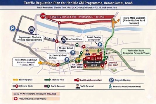 25 मार्च 2026 को पूर्वाहन 9 बजे से अपराह्न 4 बजे तक विद्यालय बसों का परिचालन सीमित रखा जाएगा। 24 मार्च 2026 से अगले आदेश तक आरा नगर क्षेत्र में खनन संबंधी वाहनों का प्रवेश प्रतिबंधित रहेगा। कार्यक्रम स्थल के समीप केवल अधिकृत (वीआईपी/आवश्यक सेवाएं) वाहनों को ही प्रवेश की अनुमति होगी। आपातकालीन सेवाएं (एंबुलेंस, फायर ब्रिगेड आदि) के आवागमन में किसी प्रकार की बाधा नहीं होने दी जाएगी।