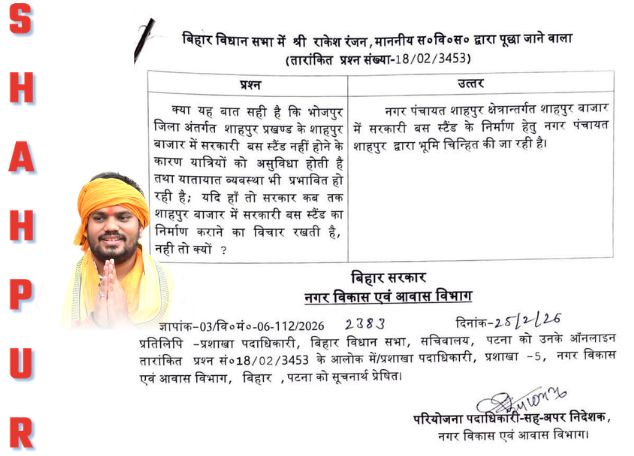 आरा। जिले के शाहपुर विधानसभा क्षेत्र के विधायक राकेश रंजन ओझा के प्रयासों से शाहपुर नगर में बहुप्रतीक्षित सरकारी बस स्टैंड के निर्माण की दिशा में सकारात्मक प्रगति के पत्र जारी की गई है। स्थानीय निवासियों और दैनिक यात्रियों की लंबे समय से चली आ रही इस समस्या को देखते हुए विधायक ने इसे प्राथमिकता के आधार पर सरकार के समक्ष रखा था। वर्तमान में व्यवस्थित बस स्टैंड न होने के कारण यात्रियों को प्रतिदिन काफी कठिनाइयों का सामना करना पड़ता है और सड़क पर ही वाहनों के अनियंत्रित पड़ाव से जाम की स्थिति बनी रहती है।