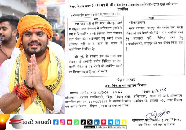 शाहपुर के दुकानदारों की इस पीड़ा को गंभीरता से लेते हुए विधायक राकेश रंजन ओझा ने बिहार विधानसभा के 18वें सत्र में तारांकित प्रश्न के माध्यम से इस मुद्दे को प्रमुखता से उठाया। उन्होंने सरकार से सवाल किया कि क्या यह सत्य है कि शाहपुर नगर पंचायत में अतिक्रमण हटाने के कारण विस्थापित हुए सब्जी विक्रेताओं, ठेला संचालकों तथा वेंडरों को स्थाई बाजार उपलब्ध नहीं कराए जाने के कारण वे आजीविका से वंचित हैं। विधायक ने स्पष्ट रूप से पूछा कि सरकार कब तक उक्त नगर पंचायत में सरकारी जमीन चिन्हित कर इन वेंडरों को आवंटित करने का विचार रखती है।