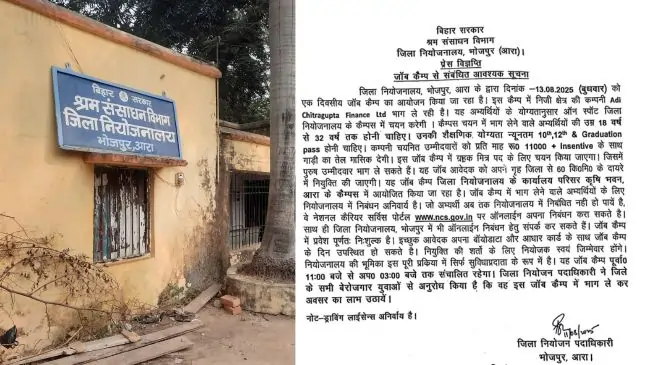 आरा। जिला नियोजनालय के द्वारा 13 अगस्त दिन बुधवार एक दिवसीय जॉब कैम्प का आयोजन किया जा रहा है। इस कैम्प में निजी क्षेत्र की कम्पनी Adi Chitragupta Finance Ltd भाग ले रही है। यह अभ्यर्थियों के योग्यतानुसार ऑन स्पॉट जिला नियोजनालय के कैम्पस में चयन करेगी। कैम्पस चयन में भाग लेने वाले अभ्यर्थियों की उम्र 18 वर्ष से 32 वर्ष तक होनी चाहिए। उनकी शैक्षणिक योग्यता न्यूनतम 10th, 12th & Graduation pass होनी चाहिए।