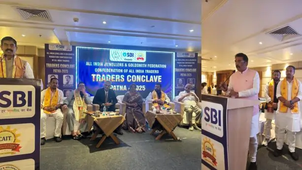 Traders Conclave – 2025: पटना के एक्जीबिशन रोड स्थित होटल लेमन ट्री प्रीमियर में रविवार को ऑल इंडिया ज्वेलर्स एंड गोल्डस्मिथ फेडरेशन (एआईजेजीएफ) और कन्फेडरेशन ऑल इंडिया ट्रेडर्स (कैट) के द्वारा एसबीआई प्रेजेंटेड ट्रेडर्स कान्क्लेव-2025 का आयोजन किया गया।